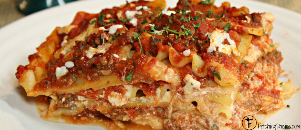 Once meat sauce is ready spread 1/2 cup into the bottom of 9 x 13 lasagna baking dish. Line pan with layer of lasagna noodles. Spoon layer of cheese mixture over noodles (enough to cover all the noodles) Add layer of meat sauce, sprinkle mozzarella cheese over then add another layer of noodles. Repeat process until pan is filled 3/4 full.