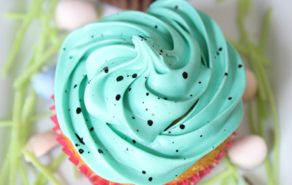 In medium mixing bowl combine all ingredients using an electric mixer until smooth. Use small paint brush dipped in black food dye and flick brush to speckle frosting to give it the robin egg look.