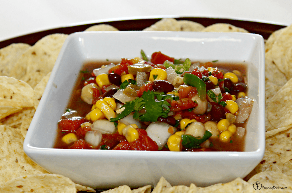 In a large bowl combine all the ingredients and mix together. You can add more or less salt than listed above, I usually prefer this salsa to be a little bit more salty.